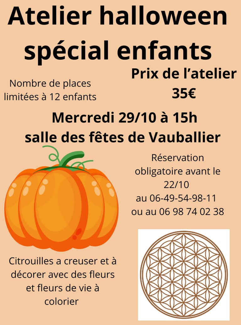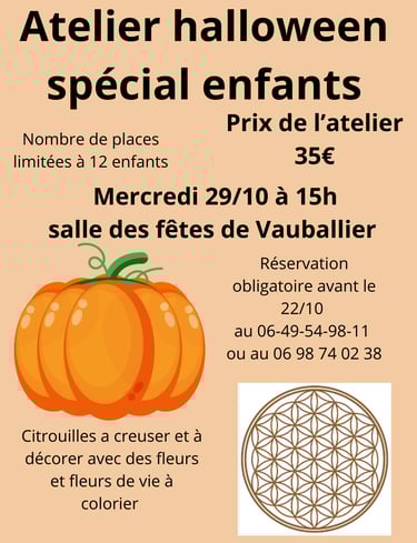 Atelier Enfant Citrouille et Coloriage : Le 29 /10 avec Mélanie et Lise ( par fleurs et par chemin) 35€ à la salle des fêtes sur réservation