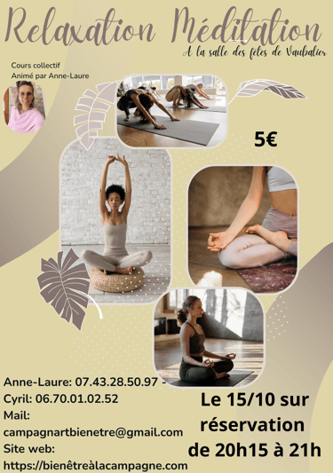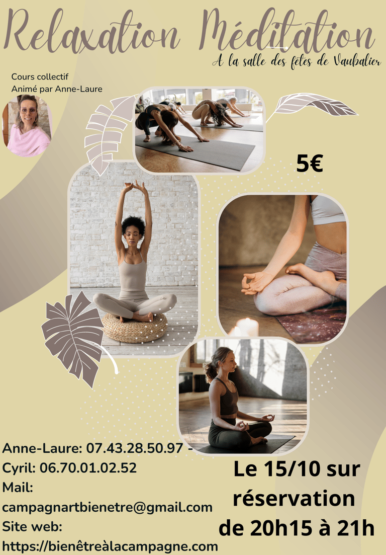 Relaxation & Méditation : Le 15/10 de 20h15 à 21h avec Anne Laure, 5€ sur réservation, salle des fêtes.