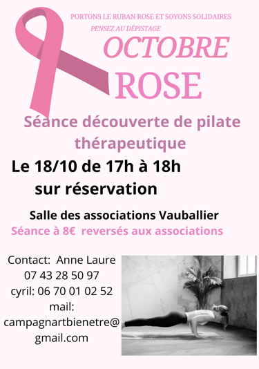Cours de Pilate Thérapeutique avec Anne Laure de 17 à 18h , séance à 8€ reversé aux associations sur réservation.