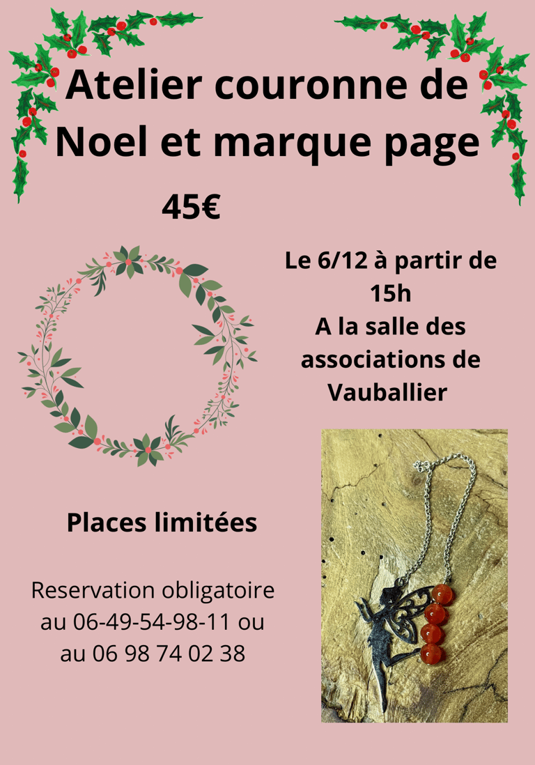 Atelier Couronne de Noël et Marque Page : Le 06/12 avec lise et Mélanie, 45€ sur réservation dans la salle des associations